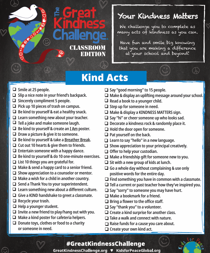 - 2/2 - 2/6 Kindness Challenge & Extravaganza Week (2/2 Kindness Rally!) See "Kind Acts" below and attached.